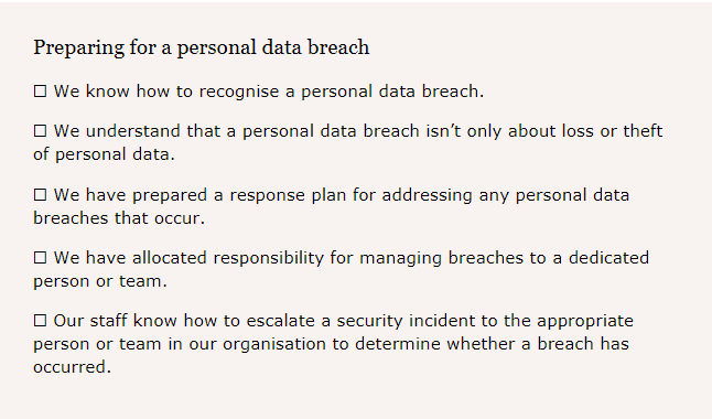 The ICO have prepared a checklist for use to ensure your business is prepared for any potential data breaches.